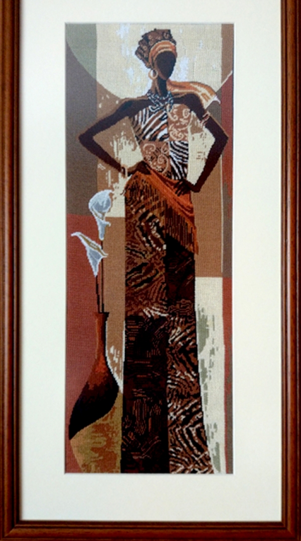 Goblen africana cusut pe panza imprimata cu doua fire. Inramat cu sticla antireflex