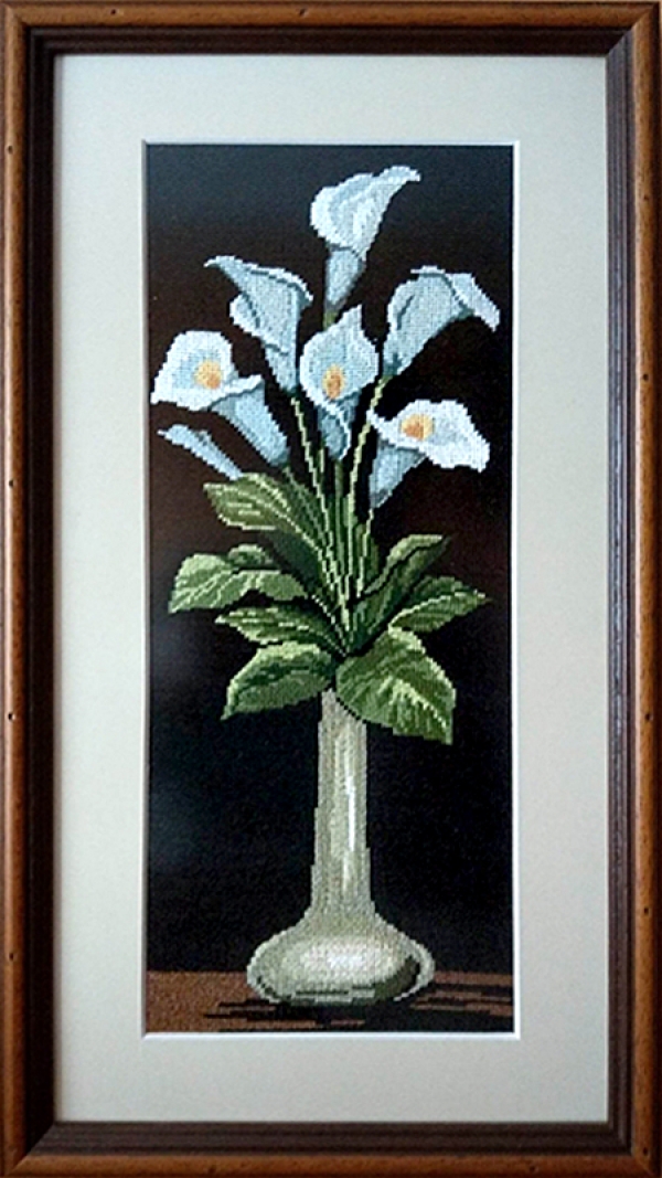 Goblen lucrat pe pânză tip F cu trei fire din 16 culori. Timp de lucru 1 lună. Înramat cu sticlă antireflex.