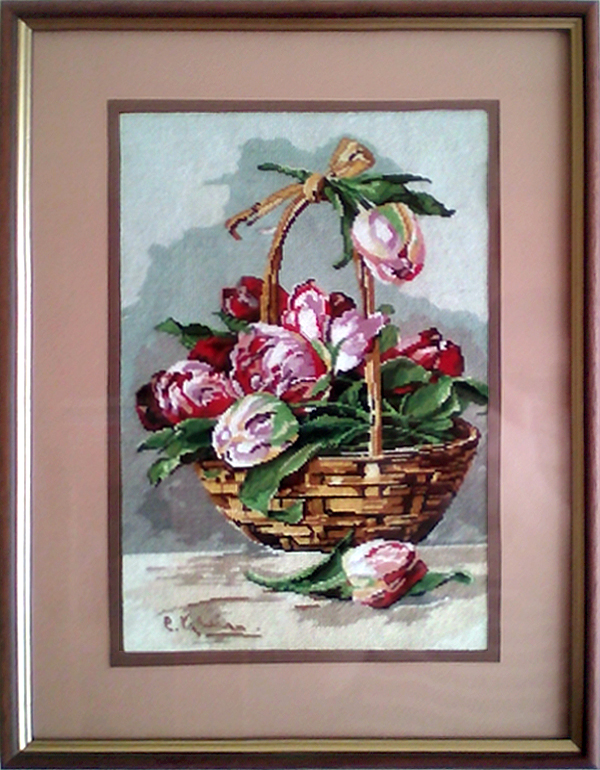 Goblen cusut Cos cu lalele