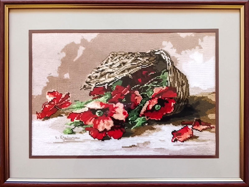Goblen imprimat ,cusut pe pânză tip D,format din 16 culori,timp de lucru două luni.