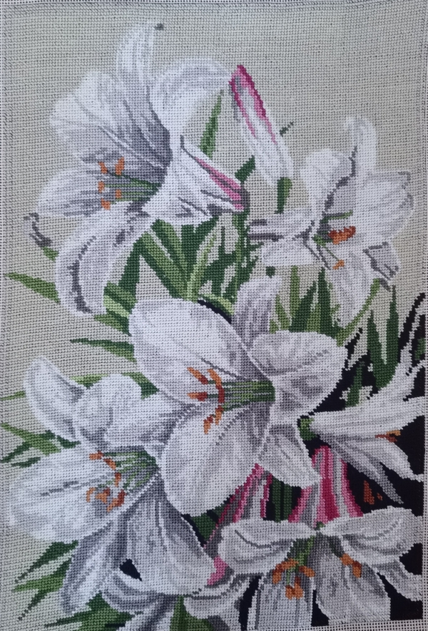 Goblen imprimat pe panza tip D, cusut cu 3 fire, format din 13 culori, timp de lucru aproximativ 2 luni.
