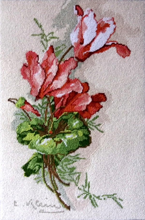 Goblen Cyclamen, model imprimat, cusut in 2 fire, pe panza de tip A, format din 18 culori, marimea 17 x 25 cm, nou.