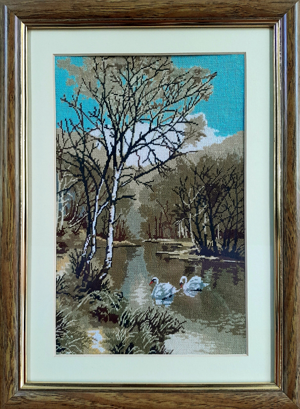 Goblenul "Lebede" Culori 18 Dimensiunea goblenulu 20x30cm Inramat are dimensiunea de 29x39cm