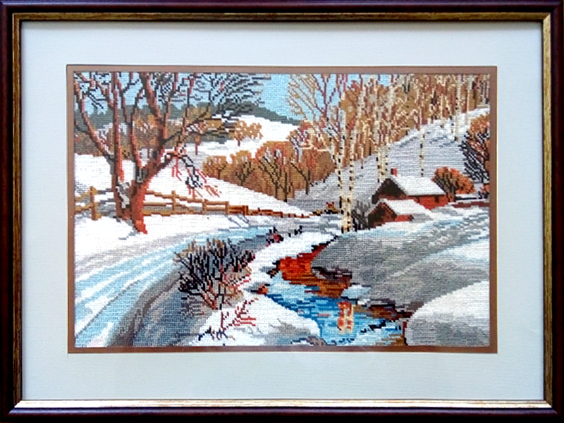 Goblen inprimat,cusut pe pînzā tip D,format din24 culori,timp de lucru 6 sāptāmîni si este înramat.