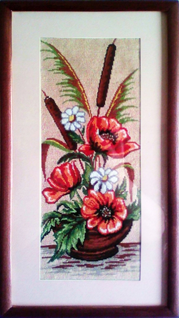Goblenul Maci de camp este inramat, care are dimensiunea 12x30 cm, cusute cu 2 fire si vopsita.