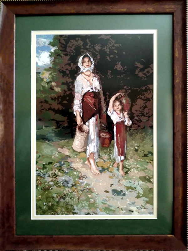 Goblen imprimat, cusut cu doua fire, 28 de culori, dimensiuni 25/40, inramat 32/52, paspartu, goblen deschis cu verde, rama de lemn, geam antireflex. Pentru verificare pot sa arat, la cerere, fotografie cu partea din spate a goblenului. Transport asigurat.